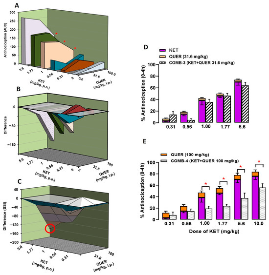 (A–C) Three-dimensional graphics from the analysis of the interaction of the antinociceptive effect of the combination of ketorolac (KET) with QUER. (A) Doses of KET (Y-axis) and QUER (X-axis) and their antinociceptive effects in individual administration or in combination (Z-axis). (B) Subtraction of the antinociceptive effect of each combination minus the individual effect of KET and QUER. (C) Surface of synergistic interaction of the antinociceptive effect of ketorolac (KET) with QUER. The red circle indicates the combination that induced the maximum antinociceptive interaction (MAI) of this combination. (D,E) Two-dimensional graphics showing the individual effects of KET and QUER at 31.6 mg/kg (D) or 100 mg/kg (E). In both, the first bar shows the antinociceptive effect of KET and QUER in individual administration and represents the sum of the individual effects of the drugs (expected effect), while the second bar (with a white background) represents the antinociceptive effect obtained experimentally with the respective combination. * p < 0.05 vs. expected effect (addition of the antinociceptive effect of KET and QUER in individual administration). Two-way ANOVA followed by Tukey’s test.