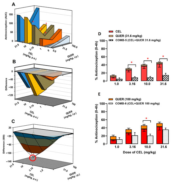 (A–C) Three-dimensional graphics from the analysis of the interaction of the antinociceptive effect of the combination of celecoxib (CEL) with QUER. (A) Doses of CEL (Y-axis) and QUER (X-axis) and their antinociceptive effects in individual administration or in combination (Z-axis). (B) Subtraction of the antinociceptive effect of each combination minus the individual effect of CEL and QUER. (C) Surface of synergistic interaction of the antinociceptive effect of celecoxib (CEL) with QUER. The red circle indicates the combination that induced the maximum antinociceptive interaction (MAI) of this combination. (D,E) Two-dimensional graphics showing the individual effects of CEL and QUER at 31.6 mg/kg (D) or 100 mg/kg (E). In both, the first bar shows the antinociceptive effect of CEL and QUER in individual administration and represents the sum of the individual effects of the drugs (expected effect), while the second bar (with a white background) represents the antinociceptive effect obtained experimentally with the respective combination. * p < 0.05 vs. expected effect (addition of the antinociceptive effect of CEL and QUER in individual administration). Two-way ANOVA followed by Tukey’s test.