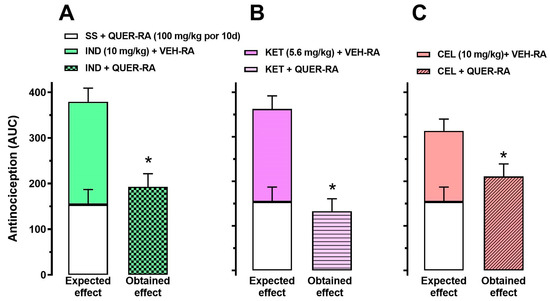 Area under the curve from the temporal courses of the effect of repeated administration (RA) of QUER on the antinociception induced by IND (A), KET (B), or CEL (C). In this protocol, the animals were pretreated with VEH (VEH-RA) or QUER 100 mg/kg/day for 10 days (QUER-RA). The administration of NSAIDs or saline solution (SS) was performed on the 11th day, 2 h after the intraarticular administration of uric acid. Each bar represents the mean ± SEM of six animals. The expected effect is the sum of SS + QUER-RA with the respective NSAID + QUER-RA, while the obtained effect is the experimental effect of each combination. * p < 0.05, unpaired two-tailed Student’s t-test.