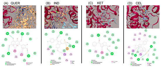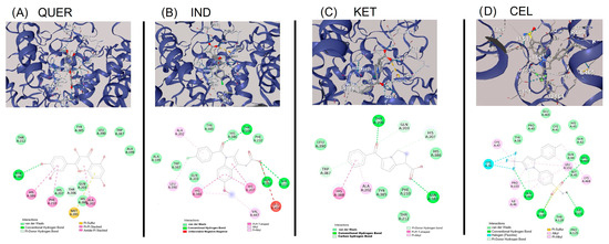 Molecular docking analysis with COX-2 enzyme, 3D binding poses in the COX-1 active site showing hydrogen bonds and π-π interactions, and 2D interaction map highlighting interactions of (A) quercetin (QUER), (B) indomethacin (IND), (C) ketorolac (KET), and (D) celecoxib (CEL).