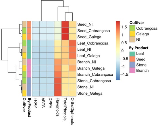 Heatmap of standardized phenolic content and antioxidant capacity in olive oil by-products from three cultivars (NI, ‘Cobrançosa’, and ‘Galega’). The hierarchical clustering was performed using Z-score normalized values for total phenols, ortho-diphenols, flavonoids, ABTS, DPPH, and FRAP. Samples are grouped by cultivar and by-product (leaf, seed, branch, stone), revealing distinct biochemical profiles. Higher values are represented in red and lower values in blue. ‘Cobrançosa’ and NI samples, especially from seeds and leaves, clustered separately based on their enriched phenolic and antioxidant profiles.