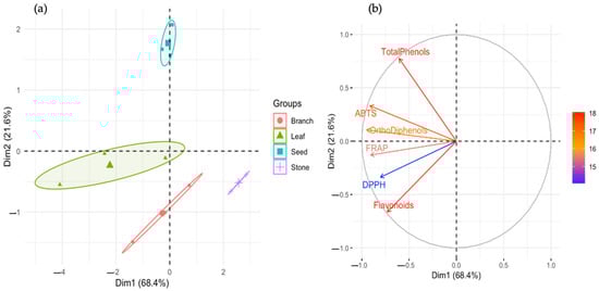 Principal component analysis (PCA) of phenolic content and antioxidant capacity across olive oil by-products. (a) PCA score plot showing sample clustering by by-product type (leaf, seed, branch, stone) and cultivar (NI, ‘Cobrançosa’, ‘Galega’). PC1 (68.4%) and PC2 (21.6%) explain most of the data variance. Samples with high phenolic content and antioxidant activity (e.g., NI seeds and Cobrançosa leaves) cluster separately from low-phenolic groups (e.g., stones). (b) PCA loading plot (variable contribution) illustrating the influence of each variable on PC1 and PC2. Total phenols and ortho-diphenols contribute strongly to PC1, while flavonoids and ABTS drive variation along PC2. Arrow length and direction indicate variable importance and correlation with sample grouping.