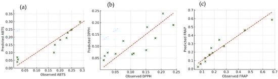 To validate and quantify these relationships, PLS regression was used to model the antioxidant activity based on phenolic markers. As shown in Figure 3, strong correlations were observed between the predicted and actual antioxidant capacity across all assays, with R2 values exceeding 0.9 for ABTS, DPPH, and FRAP. Ortho-diphenols consistently emerged as the best predictor of the antioxidant activity, followed by total phenols and flavonoids. These results agree with studies on other plant matrices, such as grape and cherry by-products, where PLS regression confirmed phenolic concentration as a reliable proxy for antioxidant function [47,48]. Figure 3 illustrates the relationship between observed and predicted antioxidant capacities (ABTS, DPPH, and FRAP), derived from PLS regression models based on phenolic content. Each green marker represents an individual sample, with the x-axis denoting the experimentally observed values and the y-axis representing the model’s predicted output. The dashed red line corresponds to the ideal 1:1 relationship, reflecting perfect agreement between prediction and observation. Data points closely aligned with this line indicate a high degree of predictive accuracy, whereas greater deviations suggest less precise estimations. Overall, the clustering of most samples near the diagonal line confirms the robustness of the PLS model in capturing the contribution of phenolic traits to antioxidant activity across assays. Among the three assays, the FRAP model demonstrated the highest predictive accuracy, followed by ABTS and, lastly, DPPH.