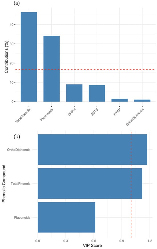 Comparison of variable importance across PCA and PLS models. (a) Contribution of phenolic and antioxidant markers to Principal Component 2 (Dim2) from PCA. Total phenols and flavonoids were the dominant contributors, suggesting that Dim2 captures phenolic variation more than antioxidant response. (b) Variable importance in projection (VIP) scores from PLS regression modeling ABTS antioxidant capacity. Ortho-diphenols and total phenols had VIP scores > 1, confirming their role as major predictors. The red dashed line indicates the VIP threshold of 1.