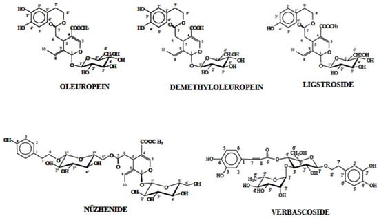 Chemical structures of secoiridoid derivatives and phenyl alcohols of olives.