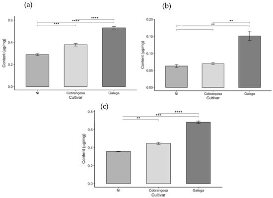 Chlorophyll content in olive leaves from three cultivars (NI, Cobrançosa, and Galega): (a) Chlorophyll a, (b) Chlorophyll b, and (c) Total chlorophyll (a + b), expressed as mean ± SD (n = 3). Statistical differences were assessed by pairwise t-tests. Asterisks indicate significance levels: p < 0.01 (**), p < 0.001 (***), and p < 0.0001 (****).