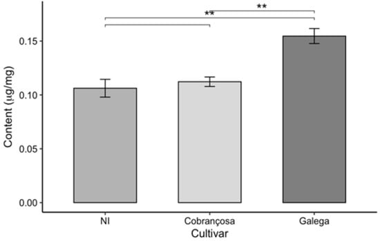 Carotenoid content in olive leaves from three cultivars (NI, Cobrançosa, and Galega), shown as mean ± SD (n = 3). Pairwise t-tests were used for statistical comparison. Asterisks indicate significance levels: p < 0.01 (**).