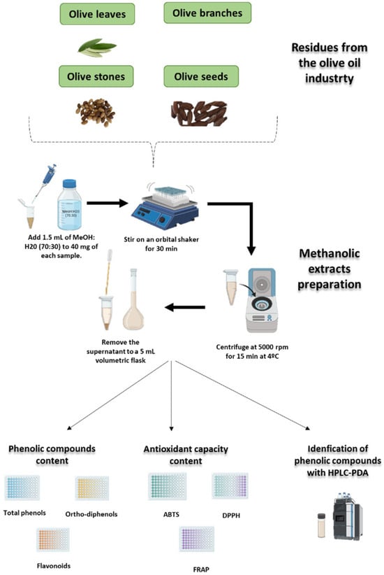 Schematic representation of the methodology used to extract and quantify polyphenols (total phenols, ortho-diphenols, and flavonoids), measure antioxidant capacity (FRAP, DPPH, and ABTS), and identify individual phenolic compounds by high-performance liquid chromatography in olive leaves, branches, seeds, and stones.