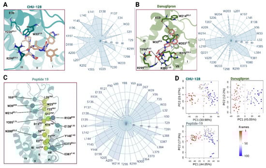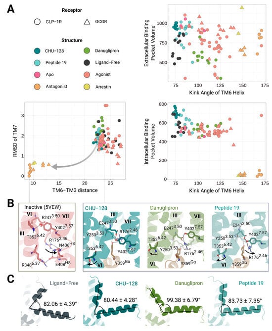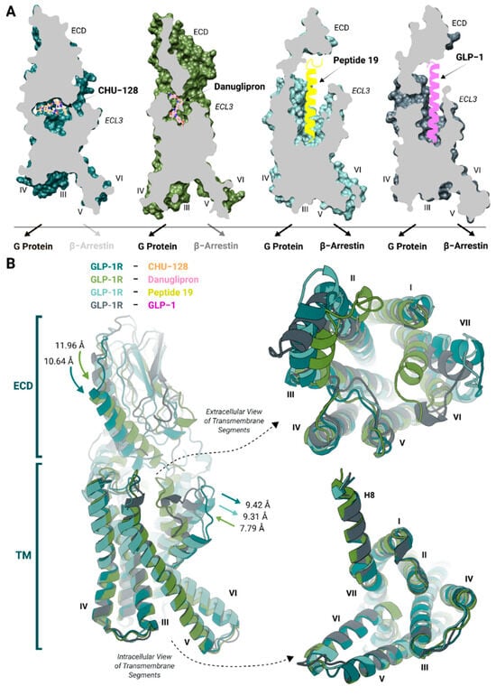 (i) The location of each ligand bound to the receptor. Static structural analyses of ligand–receptor complexes indicate that danuglipron inserts deeply in the receptor’s binding cavity closing the binding pocket, whereas CHU-128 adopts a planar binding pose above the helical transmembrane bundle, close to the extracellular domain (ECD), extracellular loop 1 (ECL1), and ECL2 liberating regions around TM6-TM7 [30] (Figure 1A). The position and binding modes of small-molecule agonists involve different structural modulations associated with distinct pharmacology profiles. Peptide agonists are integrally buried with a longitudinal orientation in the receptor’s binding vestibule, forming a helical structure within the transmembrane segments [36] (Figure 1). Either balanced or biased small-molecule agonists form a limited number of interactions with the core vestibule, suggesting that the extracellular interface plays a more critical role in signaling preferences than the buried region of the binding pocket. The contact with different transmembrane segments drives biased and balanced agonists to induce similar G protein-bound conformations at the intracellular binding site, thereby regulating the binding affinity of downstream proteins. Effectively balanced agonists confer the receptor a greater degree of conformational flexibility, shifting the intracellular binding site from a large, open to more restrained state [37].