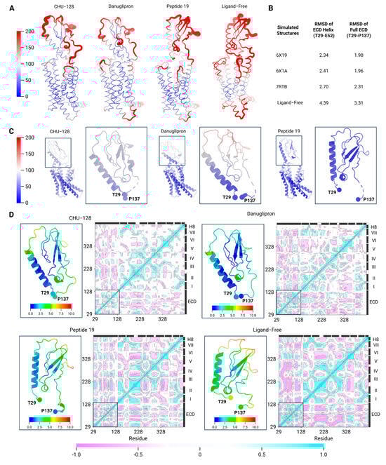 Residue-level dynamic cross-correlation maps of GLP-R during MD simulations. (A) Visualization of Cα backbone atom displacement in the ECD region, where blue and red represent low and high fluctuations. Representation of the receptor conformational motion in putty representation. The receptor structure is colored by B-factor values of GLP-1R estimated from the fluctuations of residues during simulation. (B) RMSD of ensemble simulation structures of GLP-1R-ligand complexes. (C) Representation of experimental structures of ECD region colored by the experimentally determined B-factor. (D) The dynamic cross-correlation analysis reveals correlated motions among key structural domains of the receptor, including ECD, ECL, ICL, and TM regions. The correlation coefficients range from −1 to 1, representing the complete negative correlation (blue) and complete positive correlation (red), respectively. The sequence of GLP-1R is color-coded by domain: ECD (yellow), ECL (blue), ICL (green), TM (pink), and Helix 8 (purple). Each simulation was run for 500 ns with n = 3 independent replicates. The Roman numbers from I to VII indicate TM segments of the receptor.