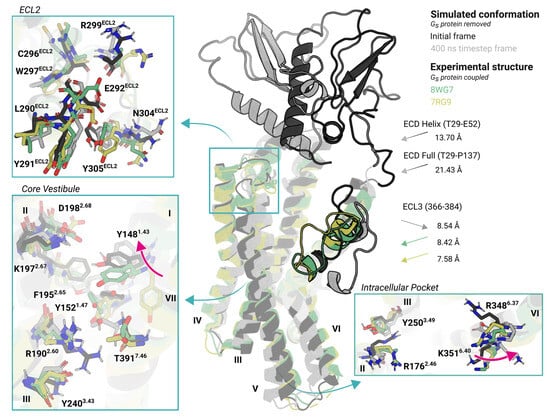 To further establish the inherent dynamics of the receptor binding, we compared the simulated ligand-free structures to experimentally resolved ligand-free structures in complex with G proteins. Although these experimental structures have the capacity to engage in downstream signaling, the activation process shows reduced efficacy and frequency [32]. Our simulations captured near-native conformations of ligand-free structures (Figure 3), but two regions exhibited noticeable differences: the ECD and TM6-ECL3-TM7 segment. In the reference structure (initial frame), the helical structure of the ECD is oriented parallel to the transmembrane domain; however, in two simulation replicas, it is repositioned deeper in the orthosteric binding pocket (Figure S3). Notably, the ECD helix undergoes a pronounced shift of approximately 18 Å toward the ECL1 and ECL2 interface (Figure 3), a transitional conformation engaged that is rarely observed in computational approaches [43] or experimental structures [33]. This repositioning may result in transient ECD transmembrane contacts that influence the receptor’s conformational ensemble. Nevertheless, the resulting structure appears insufficiently stabilized to achieve full activation and remains less stable than agonist-bound conformations [33].