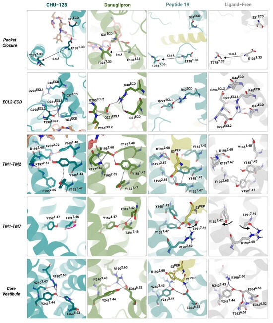 Previous studies have emphasized the important role of W33ECD for ligand recognition and binding [29,44] (Figure 4). However, the specific chemical architecture of each ligand induces distinct extracellular rearrangements, which are followed by conformational changes in TM1 and TM7 (Figure 5). The binding mode of danuglipron promotes a compact conformation by stabilizing the ECD toward TM1 and TM7, leading S31ECD to form a hydrogen bond network with E1381.33 and T3787.33, thereby repositioning TM7 closer to TM1 and effectively enclosing the binding pocket. In contrast, the ligands CHU-128 and Peptide 19 hinder this convergence by acting as steric barriers. This results in an increased distance between E1381.33 and T3787.33 (~13.6 Å of Cα of residues), preventing closure of the TM1-TM7 interface.