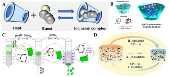 (A) Schematic diagram of CD forming a host–guest complex with a guest molecule [4], Copyright © 2025 Elsevier B.V.; (B) Schematic illustration of the host–guest complex formed between Ad and β-CD, wherein the hydrophobic Ad moiety is encapsulated within the hydrophobic cavity of β-CD through supramolecular interactions, Copyright © 1999–2025 John Wiley and Sons, Inc or related companies; (C) Photoresponse processes of Azo-CD complexes, Copyright © 2025 Springer Nature Limited; (D) Oxidizes Fc to Fc+ to disassemble the host–guest complex, Copyright © 2023 Elsevier Inc.