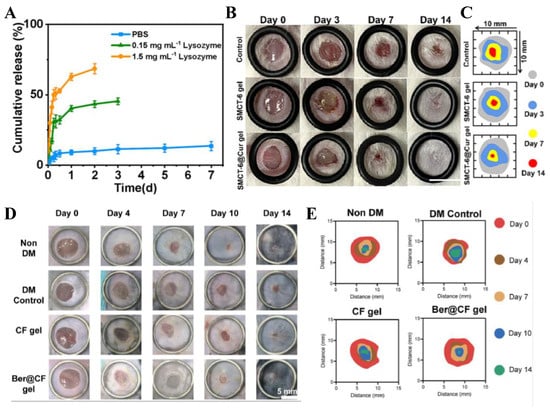 Curcumin (Cur), as a natural hydrophobic drug, combines antibacterial, anti-inflammatory, and antioxidant activities. In order to solve the defects of poor water solubility, chemical instability, and low bioavailability, Shi et al. grafted adamantane onto water-soluble carboxyethyl chitin (CECT) and synthesized β-cyclodextrin aldehyde (β-CD-CHO) synchronously. The β-CD-CHO both forms inclusion complexes with adamantane via host–guest effects and generates hydrazone bonds with adipic dihydrazide grafted on CECT through aldehyde groups, thereby successfully preparing supramolecular hydrogels loaded with Cur (SMCT@Cur) [49]. Reversible host–guest cross-linking endowed the SMCT hydrogels with excellent injectability, self-healing, and shape adaptation. Chitin can be specifically degraded by lysozyme, and the formation of β-CD@Cur complexes during the initial stage of hydrogel degradation facilitates the diffusion of Cur. Consequently, these hydrogels exhibit excellent lysozyme-dependent drug release properties (Figure 3A) and can significantly promote wound healing in skin and other tissues (Figure 3B,C), making them ideal therapeutic dressing materials.
