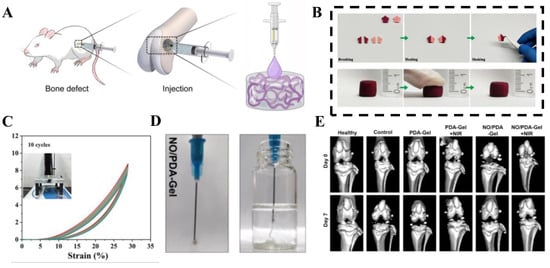 (A) Schematic diagram of supramolecular hydrogel for bone regeneration, modify from [70,71], Copyright © 2025 Elsevier B.V.; (B) Digital images showing hydrogel self-healing behavior as well as compression testing, Copyright © 2025 Elsevier B.V.; (C) Cyclic compression test curve of SF@HG@HA with 20% HA, Copyright © 2025 Elsevier B.V.; (D) Squeeze the hydrogel in PBS with a 28 G needle, Copyright © 2025 Elsevier B.V.; (E) 3D reconstruction images of knee joints, Copyright © 2025 Elsevier B.V.