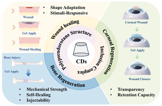 In conclusion, the development of CD-based hydrogels will advance the next generation of regenerative therapies [44,45]. In the following section, the application of CD-based supramolecular hydrogels in tissue repair and regeneration will be discussed, focusing on three major areas: wound healing, corneal regeneration, and bone regeneration.