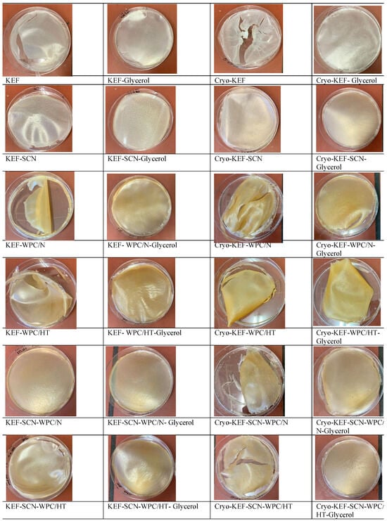 Images of kefiran films prepared with or without milk proteins (sodium caseinate—SCN, whey protein—WPC, native—N or heat-treated—HT), glycerol and cryo-treatment.