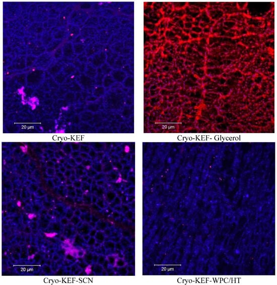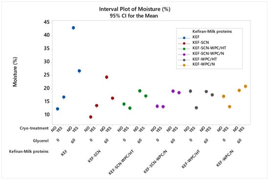 Cryo-treatment increased the moisture content of the control sample (KEF) and that of the samples prepared with sodium caseinates, but it significantly reduced the moisture content of the corresponding films when these were prepared with glycerol. In contrast, in the presence of whey proteins, cryo-treatment did not increase film moisture, but in most cases, it rather reduced it when compared to the kefiran–whey protein films without cryo-treatment.