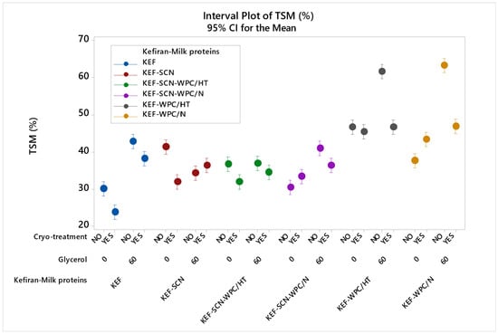 Total soluble matter (TSM) of kefiran films prepared with or without milk proteins (sodium caseinate—SCN, whey protein—WPC, native—N or heat-treated—HT), glycerol and cryo-treatment. Vertical bars with no overlaps differ significantly.