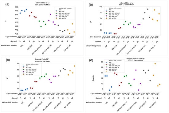 According to ANOVA, all factors studied significantly affected (p < 0.05) the color parameters and opacity of the kefiran films, as shown in Figure 6. Whey proteins, native or heat-treated, reduced film brightness (Figure 6a), increasing the intensity of red (Figure 6b) and yellow (Figure 6c) color alongside opacity (Figure 6d). This is also evident from the images of kefiran–milk protein films presented in Figure 1. Caseinates, with or without the presence of native milk proteins, in the absence of glycerol, and combined with the application of cryo-treatment, resulted in maintaining film brightness. Kefiran film opacity greatly reduced in the presence of glycerol, irrespective of milk proteins and cryo-treatment. Glycerol also increased the films’ brightness only in the absence of milk proteins.