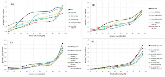 Adsorption isotherms of kefiran films prepared with or without milk proteins (sodium caseinate—SCN, whey protein—WPC, native—N or heat-treated—HT), glycerol and cryo-treatment. Kefiran–milk protein films without glycerol and cryo-treatment (a); kefiran–milk protein films with cryo-treatment application and without glycerol addition (b); kefiran–milk protein films with glycerol addition and without cryo-treatment (c); kefiran–milk protein films with glycerol and cryo-treatment (d).