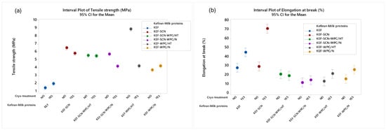 According to ANOVA, all factors studied exhibited a significant effect (p < 0.05) on films’ mechanical properties. As can be observed in Figure 8, kefiran films prepared with the incorporation of milk proteins exhibited higher values of tensile strength when compared to the control samples (without proteins). Heat-treated whey proteins, without cryo-treatment, exhibited the highest tensile strength. This increase in tensile strength in the presence of milk proteins can be credited to the increased concentration of macromolecules in the system, which form cross-linkages between them, creating a more dense and durable structure with regards to tensile strength. This effect is further enhanced through heat-induced denaturation of the milk proteins, which further increases the formation of cross-linkages between them.