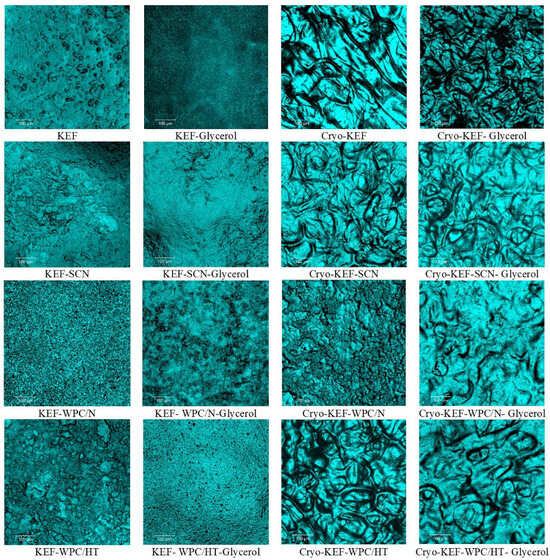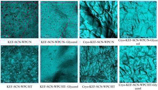 Surface morphology of kefiran films prepared with or without milk protein mixtures (sodium caseinate—SCN, whey protein—WPC, native—N or heat-treated—HT), glycerol and cryo-treatment (Cryo) at magnifications of ×100.
