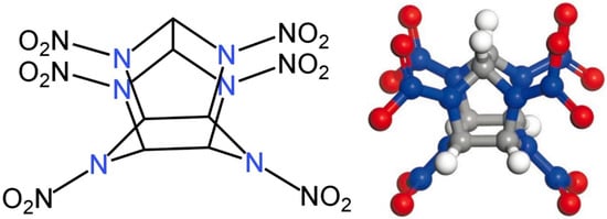 The chemical structure (left) and ball-and-stick model (right) of CL-20. The gray ball in ball-and-stick model is Carbon (C), blue is Nitrogen (N), red is Oxygen (O) and white is Hydrogen (H).