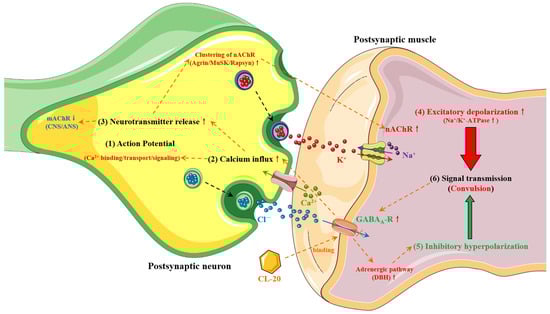 CL-20 may bind to the convulsive site of the GABAA ion channel, which may result in a reduction in the average duration of channel openings and a decrease in Cl− channel permeability, subsequently leading to diminished inhibitory postsynaptic currents [40]. The decrease in Cl− permeability can facilitate action potentials via multiple voltage-gated Ca2+ channels, thereby promoting intracellular Ca2+ influx. This process leads to an augmented excitatory depolarization as part of a feedback loop mechanism, encompassing the subsequent molecular events: (1) An augmented release of the neurotransmitter acetylcholine; (2) the aggregation of nicotinic acetylcholine receptors (nAChR) resulting in the upregulation of the Agrin-MuSK signaling pathway; (3) the stimulation of nAChR synthesis and membrane depolarization through the enhancement of Na+/K+-ATPase activity and Na+ influx; (4) a downregulation of muscarinic acetylcholine receptors (mAChR) within the CNS/ANS; (5) alterations in the expression of genes associated with calcium (Ca2+) binding, transport, and signaling pathways; and (6) an upregulation of GABAA receptor expression [40]. Upon the transfer of exposed earthworms to a non-contaminated environment, the degradation of CL-20 within the organism may occur through several mechanisms: the autophagic degradation of defective CL-20-bound GABAA-R, which are subsequently transported to autophagosomes; the dissociation of CL-20 from its binding sites; and the metabolic processing of dissociated CL-20 by cytochrome P450 or P450-like enzymes [40]. As a consequence of these and potentially numerous additional mechanisms, CL-20 is released from the NMJ, allowing effective neurotransmission at synapses to revert to baseline levels prior to exposure. This process ultimately facilitates the recovery or reversibility of neurotoxicity induced by CL-20 [40]. Nonetheless, the intricate interrelationship among these events necessitates additional comprehensive investigation.