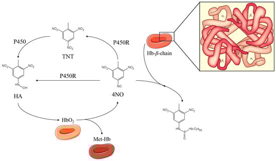 The reaction pathway of TNT and its metabolites forming adducts with hemoglobin. P450R: Cytochrome P450 reductase; Hb: Hemoglobin; HbO2: Oxyhemoglobin; MetHb: Methemoglobin.