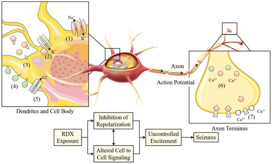 The elevation of calcium ions plays a pivotal role in the neurotoxic effects associated with RDX. The influence of RDX on neuronal calcium signaling is characterized by a transient elevation of intracellular Ca2+ concentrations, resulting in membrane excitation and subsequent neurotransmitter secretion [105]. Excitatory neurotransmitters and the rapid alterations in the electrical properties of the central nervous system, which are mediated by Ca2+, exhibit a significant correlation with the occurrence of epileptic seizures [106]. Nonetheless, the inhibition of Ca2+ channels does not entirely eliminate the elevation of Ca2+ levels triggered by RDX, a phenomenon that may be attributed to various underlying mechanisms [60]. Gust et al. identified a minimum of three mechanisms and various pathways linked to the neurotoxic effects of RDX [107]. The mechanisms identified encompass the diminishment of K+ transport across neuronal membranes, the suppression of neuronal ATPases, specifically Na+, K+-ATPase, and Ca2+-ATPase, as well as the inhibition of calmodulin’s regulatory influence on Ca2+ at axon nodes, which subsequently impacts neurotransmitter release (Figure 5). The mechanisms in question impede neuronal repolarization, augment overall neuronal excitability, and consequently result in the manifestation of epileptic seizures.