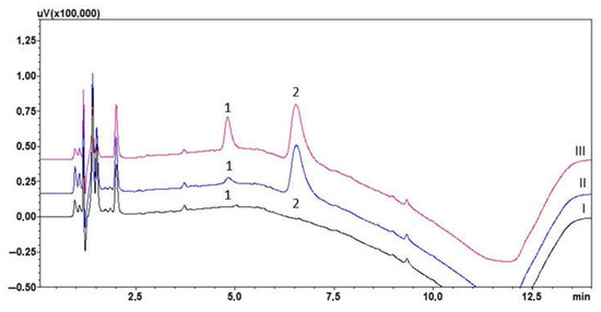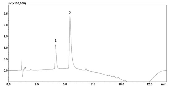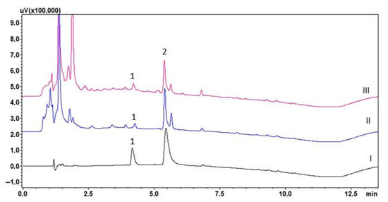 The separation was carried out using a Nexera XR UHPLC liquid chromatograph (Shimadzu, Kyoto, Japan) consisting of a CBM-20Alite control system, LC-30 AD pump, CTO-20AC thermostat, SIL-30AC autosampler, SPD-M30A UV-VIS detector with diode array, and SPD-M30A high-sensitivity measuring cell (85 mm). The stationary phase was a Nucleosil 100–5 chromatography column (C18; 125 mm × 4 mm, 5 µm; Knauer, Berlin, Germany) with a pre-column. The column temperature was 35 °C. A mixture of acetonitrile and 0.1% formic acid was used as the mobile phase at a flow rate of 1 mL/min, with a linear gradient starting with 25% acetonitrile and ending with 90% acetonitrile in 9 min. The total analysis time was 14 min.