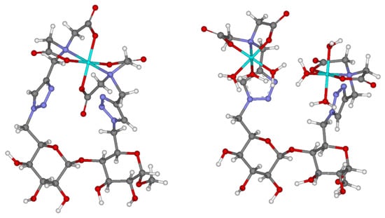 Preliminary molecular modeling supports the two proposed 1:1 and 2:1 cobalt(II):9 complexes (Figure 2). As can be seen, the free bond rotations from multiple σ-bonds responsible for the covalent attachment of the two IDA groups (from the C-6 and C-6′ positions) provide abundant freedom for the formation of octahedral coordination sphere, required for the chelation of the cobalt(II) center(s) in both complexes, resulting in the absence of distortion. Both the 1H-1,2,3-triazoles attached to adjacent glucopyranosyl units are not involved in the interactions with the metal centers.