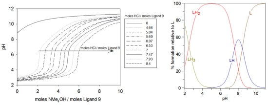 As shown in Figure 6 Left, from the potentiometric curves of ligand 9 alone, it is evident that each excess mol of HCl added needed to be neutralized by the same equivalent of NMe4OH, in the full pH range. Table 1 summarizes all the protonation constant values of 9 determined by titration curve refinement with HYPERQUAD suite [30], together with the corresponding acidity constants. All the pKa values were ascribed to the deprotonations of the carboxylate functions, followed by ammonium functions when increasing the base addition. The last carboxylate group to be deprotonated, named LH3, had a pKa (LH3/LH2) equal to 2.47. The pKa values greater than 7 could be attributed to the formation of ammonium moieties, which is in agreement with the known values for these groups (LH2/LH: 7.52–7.60; LH/L: 8.44–8.49).