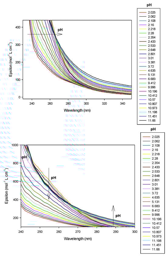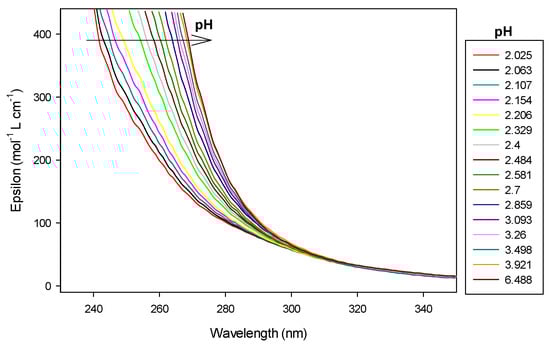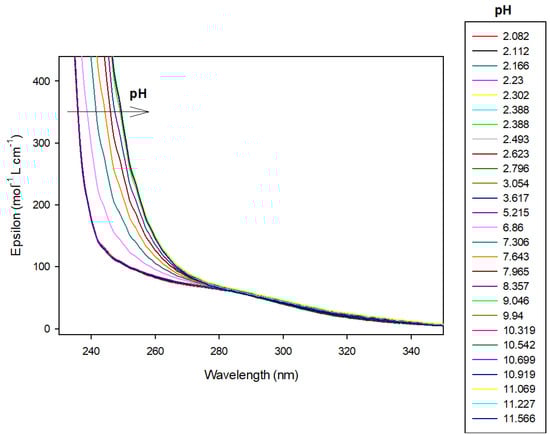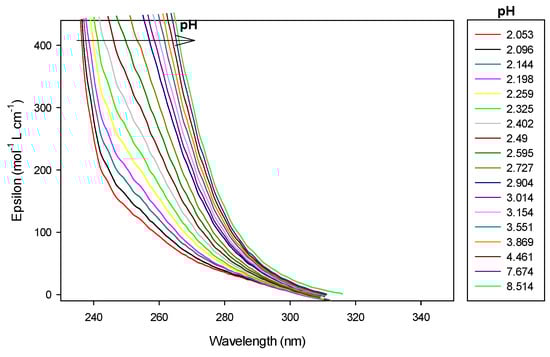 This latter ligand alone absorbs UV–visible radiation between 200 and 300 nm as can be seen in Figure 7. Therefore, we have chosen to present results of 9 alone at 250 nm wavelength. At this wavelength, absorbance increased linearly, over pH 6, with the concomitant deprotonation of amino groups. Effectively, the molar absorbance coefficient is 104.4 mol−1 L cm−1 for LH2, increasing to 278.4 and 333.6, respectively, for LH and L species, respectively, as reported in Table 2. Over pH 10, the ligand was fully deprotonated, absorbance, therefore, remained constant.