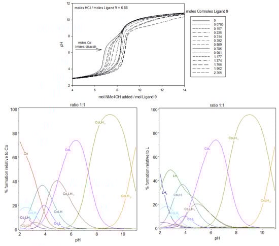 Output stability constants obtained for ligand 9 species have been used, as fixed parameters, to treat data for fitting cobalt(II) binding constants from potentiometric and spectrophotometric experiments. The obtained titration curves of the complex formed between the disaccharide ligand 9 and cobalt(II) are shown in Figure 9 and the calculated log βmlh and log Kmlh reported in Table 3. For each solution, the pH slowly increased with the addition of the base; however, the pH of the solution with the greatest cobalt(II):9 ratio increased the slowest when the same amounts of the base were added. This can be explained by the fact that during the complexation of cobalt(II), protons were released from the protonated sites of the disaccharide ligand 9, acidifying the medium. At the beginning of the titrations, for acidic pH, free cobalt(II) prevailed. Fitting the spectrophotometric titrations curves (see infra) have necessitated the incorporation of mono and dinuclear protonated complex species forms, from pH 2 (beginning pH for spectrophotometric titrations, slight below that of potentiometric experiments), CoLH2 and Co2LH2, followed by CoLH and Co2LH at pH between 3 and 4. Then, CoL and Co2L. For the highest pH, species on the form CoLH−1, CoLH−2 or Co2LH−1 and Co2LH−2 were also incorporated in the model. CoLH−1, for instance, from its notation, could come from a coordinated water molecule or from an uncoordinated nitrogen. A mixture of mono and dinuclear complexes were observed for the three studied ratios cobalt(II):9, the proportion of dinuclear complexes increasing with the cobalt(II) amount, the concentration in ligand 9 remaining constant.