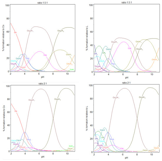 In case of ratio 1:1, free cobalt(II) ions were observed until pH 5, essentially at acidic pH. Above this pH, all the cobalt(II) ions were complexed by the ligand 9. This complexation process began at extremely low pH with the appearance of CoLH, Co2LH2 and Co2LH, in low proportions, at pH between 2 and 4. The coordination process began effectively at low pH, with the deprotonation and subsequent deprotonation of CoLH2, , with log K112 being equal to 2.6–3.2, which corresponds to the deprotonation of one of the carboxylic groups of iminodiacetate (log K013 = 2.1–2.5) after binding of cobalt(II) ion.