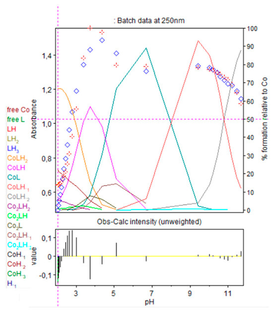 Refinement of the spectrophotometric scans for the 1:1 cobalt(II):9 complex from selected wavelengths: 240 to 340 nm. Ligand 9 concentration from 2.375 mM at pH 2.02 to 1.719 mM at pH 11.66. Presentation of the results for absorption wavelengths 250 from the Hypspec program. Diamond shape: experimental values, solid curves: calculated speciation. Calculated distribution curves were similar to those obtained by the potentiometric method, as shown in Figure 9.
