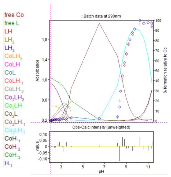 Refinement of the spectrophotometric scans for the 1.5:1 cobalt(II):9 ratio from selected wavelengths: 240 to 299 nm. Ligand 9 concentration from 2.323 mM at pH 2.05 to 1.755 mM at pH 11.40. Presentation of the results for absorption wavelengths 250 nm from the Hypspec program. Diamond shape: experimental values, solid curves: calculated speciation. Calculated distribution curves were similar to those obtained by the potentiometric method as shown in Figure 9.