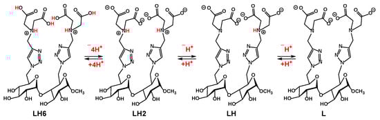 Based on the well-known pKa values for acetic acid (~4.76) and triethylammonium (~10.75) and a literature report on the pKa of the protonated 1,2,3-triazolium compound, N-methyl-1,2,3-triazolium (~1.25) [29], we can safely ignore the protonation of the two 1,2,3-triazole rings in the disaccharide 9, since it only becomes relevant at very acidic pH. Thus, in less acidic solutions, the ligand 9 contains essentially six prominent protonation sites that include the two tertiary amine centers and four carboxylates.