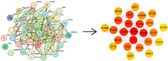 Differentially expressed genes were identified from five PD-related datasets. The differentially expressed genes were input into STRING to generate a protein–protein interaction (PPI) network. The top ten genes with the highest Maximum Clique Centrality (MCC) scores were identified as hub genes using the CytoHubba plugin in Cytoscape. After removing duplicates, a total of 28 hub genes were identified (Figure 1). The top ten hub genes are as follows: SLC6A3, TH, SLC18A2, NR4A2, DDC, KCNJ6, EN1, FOXA2, BDNF, and DRD2.