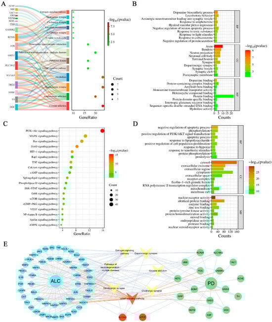 Exploration of key targets and pathways of ALC against PD. In the GO analysis, the top ten items with the highest significance among BP, CC, and MF are selected for presentation. (A) KEGG pathway enrichment analysis of PD hub genes. (B) GO functional enrichment analysis of PD hub genes. (C) KEGG pathway enrichment analysis of ALC targets. (D) GO functional enrichment analysis of ALC targets. (E) Target-pathway-disease interaction network. The ALC targets are blue, the PD hub genes are green, and the pathways are yellow.