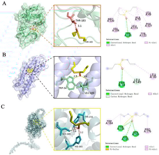 Molecular docking results. (A) Docking of ALC with PKA. (B) Docking of ALC with DAT. (C) Docking of ALC with APOE.