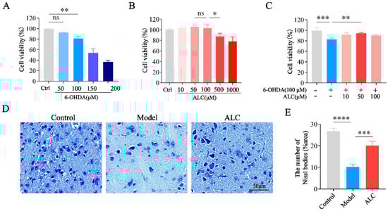 In vitro and in vivo neuroprotective effects of ALC. (A) Cytotoxicity of 6-OHDA at varying concentrations in SH-SY5Y cells. (B) Cytotoxicity of ALC at varying concentrations in SH-SY5Y cells. (C) Protective effects of ALC on 6-OHDA-induced toxicity in SH-SY5Y cells. (D) Representative images of Nissl staining. Scale bar = 50 μm. (E) Quantitative analysis of Nissl bodies (n = 3). ns represents not significant, * p < 0.05, ** p < 0.01, *** p < 0.001, **** p < 0.0001.
