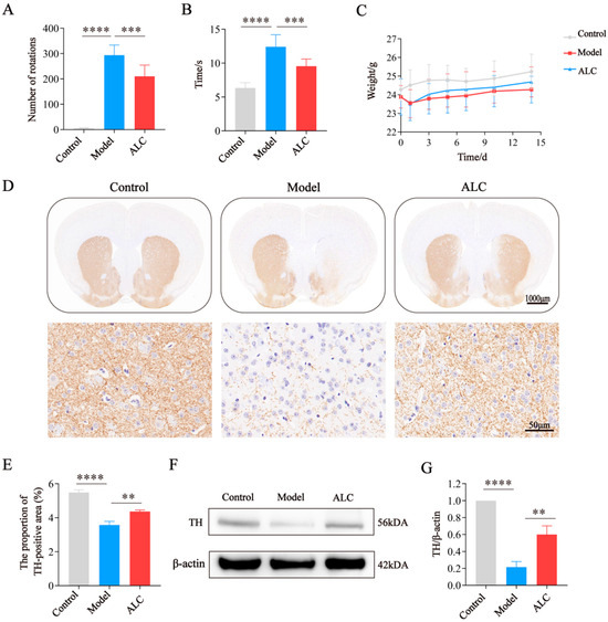 The apomorphine (APO)-induced rotation test was used to assess dopaminergic neuronal damage (Figure 5A). Compared to the model group, the ALC group exhibited a significant reduction in the number of rotations, suggesting that ALC alleviates dopaminergic neuronal damage and improves motor deficits caused by it. The Pole climbing test was used to evaluate the motor coordination of the mice (Figure 5B). Compared to the control group, the model group exhibited a significant increase in the time during the descent. In contrast, the ALC group spent less time during the descent, indicating that ALC improves motor coordination in PD mice. Changes in body weight during the experiment are shown in Figure 5C. After surgery, the mice lost weight rapidly, which slightly recovered following ALC treatment.