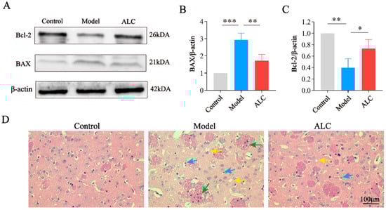 Western blot results revealed upregulated pro-apoptotic protein BAX and downregulated anti-apoptotic protein Bcl-2 expression in the model group versus controls. Following ALC intervention, BAX levels were downregulated while Bcl-2 was upregulated (Figure 6A–C). These results demonstrate ALC’s regulatory effect on apoptosis-associated proteins, thereby attenuating neuronal apoptosis.