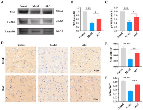 Western blot and immunohistochemistry results showed that, compared to the control group, the model group exhibited decreased levels of PKA, p-CREB (Figure 7A–C), BDNF, and DAT (Figure 7D–F). In contrast, the ALC group exhibited increased levels of PKA, p-CREB, BDNF, and DAT compared to the model group. The results indicate that ALC might promote neuronal survival by activating the PKA/p-CREB/BDNF signaling pathway and improve dopamine transport efficiency by restoring DAT protein expression, thereby exerting neuroprotective effects.