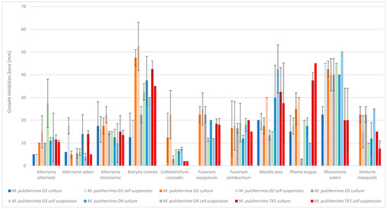Antimicrobial activity of Metschnikowia pulcherrima cultures and cells suspensions against phytopathogens, measured as growth-inhibition zones. M. pulcherrima TK1 showed a strong inhibition of all tested phytopathogens. However, the largest inhibition zones were observed for D2 and D4. The weakest yeast strain was D1, followed by D3. Statistical analysis showed that, depending on the yeast strain, the inhibition zones differed significantly for the following phytopathogens: Alternaria solani, Botrytis cinerea, Colletotrichum coccodes, Fusarium oxysporum, Phoma exigua, Rhizoctonia solani, and Venturia inaequalis (both the yeast culture and the cell suspension). No statistically significant differences in inhibition zones were observed for the following phytopathogens: A. alternata, A. tenuissima, F. sambucinum, and M. laxa, (Figure 1, Table S2). M. pulcherrima D2, D4, and TK1 were identified as the most effective at inhibiting the growth of phytopathogens. Therefore, these strains were selected for further research.