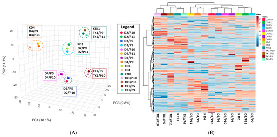 Statistical analysis of the entire MS data set. (A) Principal Component Analysis (PCA) score plot of metabolites from cultures of M. pulcherrima yeast D2, D4, and TK1 (controls: KD2, KD4, KTK11) and co-cultures of M. pulcherrima yeast strains D2, D4, and TK1 with phytopathogenic molds (P5—Rhizoctonia solani, P9—Botrytis cinerea, P10—Monilia laxa, P11—Alternaria alternata); (B) heatmap of metabolite abundance, distinguishing cultures of M. pulcherrima yeast strains D2, D4, and TK1, and co-cultures of M. pulcherrima yeast strains D2, D4, and TK1 with phytopathogenic molds (P5—R. solani, P9—B. cinerea, P10—M. laxa, P11—A. alternata). Red indicates higher relative abundance; blue indicates lower relative abundance. The color bar on the right represents the class labels for samples. Analysis performed via UHPLC-QToF-UHRMS.