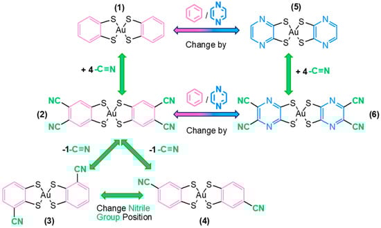 Structural formulas and structural relationship between the gold monoanionic complexes under study: [Au(bdt)2]− (1), [Au(dcbdt)2]− (2), [Au(3-cbdt)2]− (3), [Au(4-cbdt)2]− (4), [Au(pdt)2]− (5) and [Au(dcdmp)2]− (6).